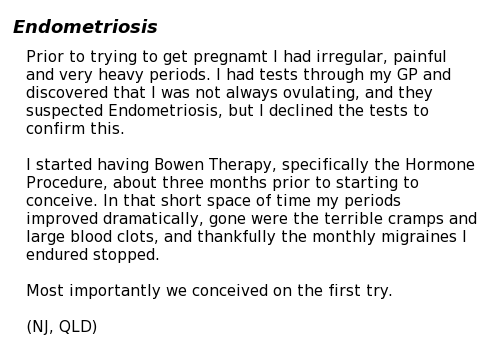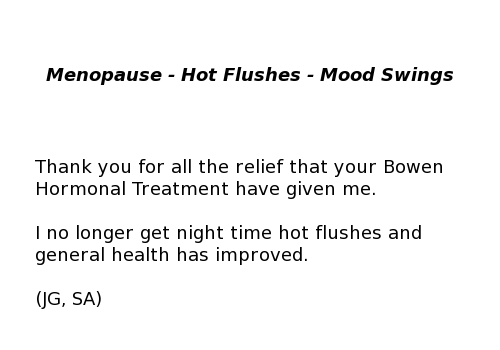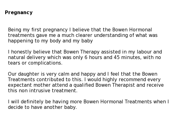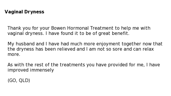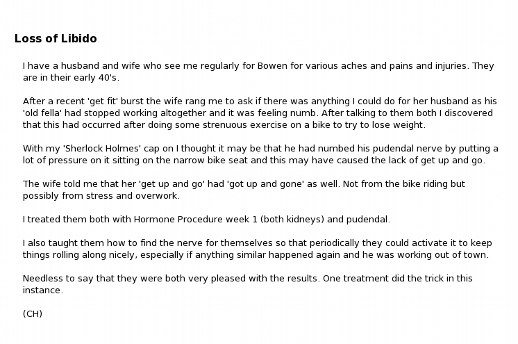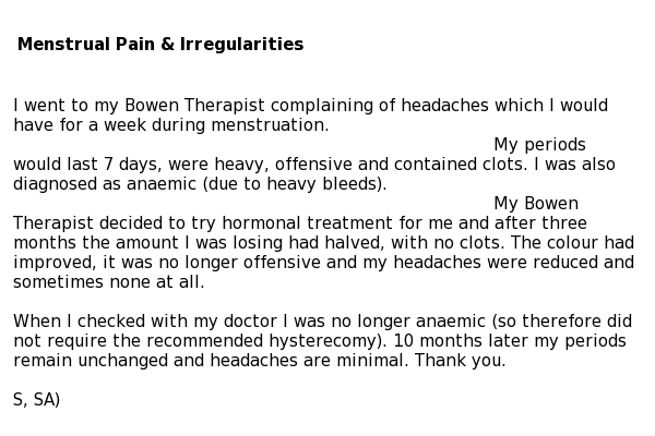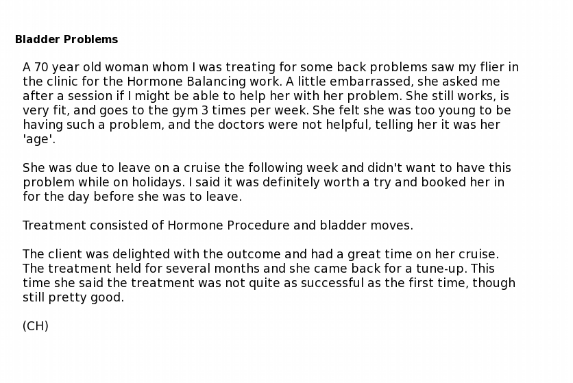 The holistic approach of Bowen Therapy has been proven to be very valuable in treating many Hormonal disorders. The following are just a few of the problems that have responded well to "Hormone Release the Bowen Way"